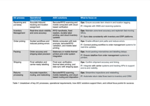 It’s time to rethink distribution execution and, while many in the supply chain are moving from AI experimentation to more widespread adoption, they should also consider the role of automatic identification and data capture (AIDC) technologies in improving efficiencies (see Table 1). AIDC technologies include barcode scanning, RFID, mobile computing, and thermal printing.